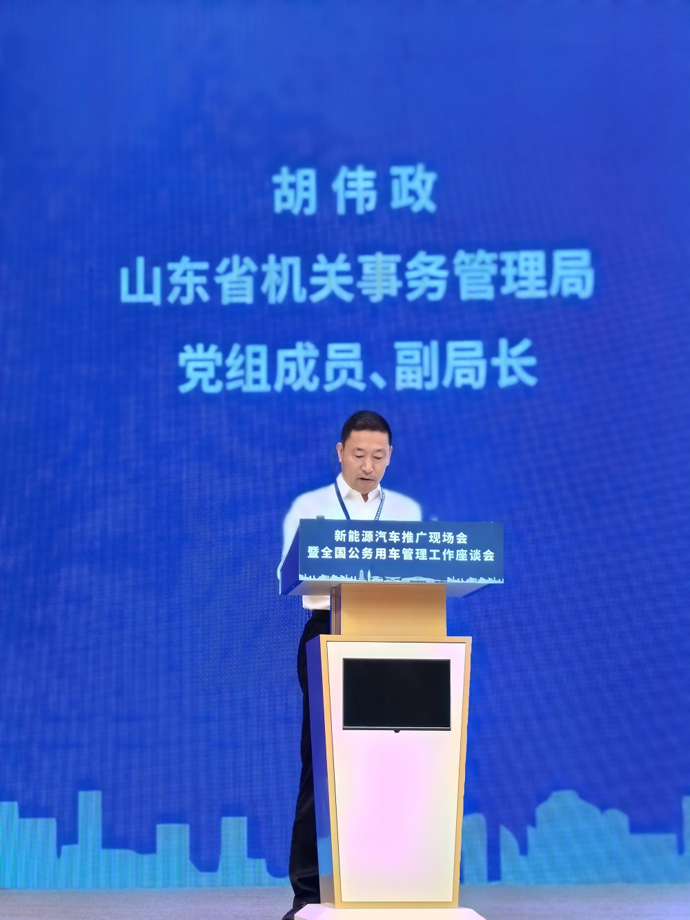 我局党组成员、副局长胡伟政围绕我省行政事业单位新能源汽车推广应用,以《强化顶层设计 坚持示范引领 扎实推进新能源汽车推广应用》为题在会上作了发言。胡伟政在发言中讲到,山东省委省政府认真贯彻中央关于新能源汽车推广应用决策部署,加快推进全省行政事业单位新能源汽车推广应用,充分发挥党政机关在绿色低碳高质量发展中的示范引领作用,全省各级机关事务部门坚持“走在前、开新局”目标定位,通过健全制度机制、强化政策导向、提高配备比例、示范引领带动、加强宣传引导等措施,积极推广应用新能源汽车,取得明显成效。